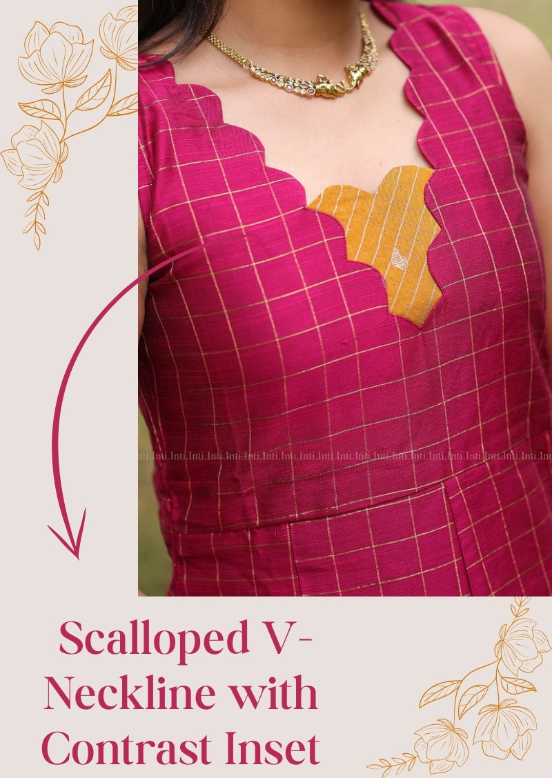 Elevate your wardrobe with the Banno Checks Top & Pant Set, a versatile ensemble designed for the modern woman. The sleeveless top features a refined scallop V-neckline with an elegant contrast piece, while the A-line silhouette offers graceful movement. Pair it with the included straight-cut pants for a polished look. Crafted in luxurious rani pink with coordinating lining, this set includes detachable elbow sleeves for styling flexibility—dress it up for formal occasions or keep it minimal for everyday sophistication.