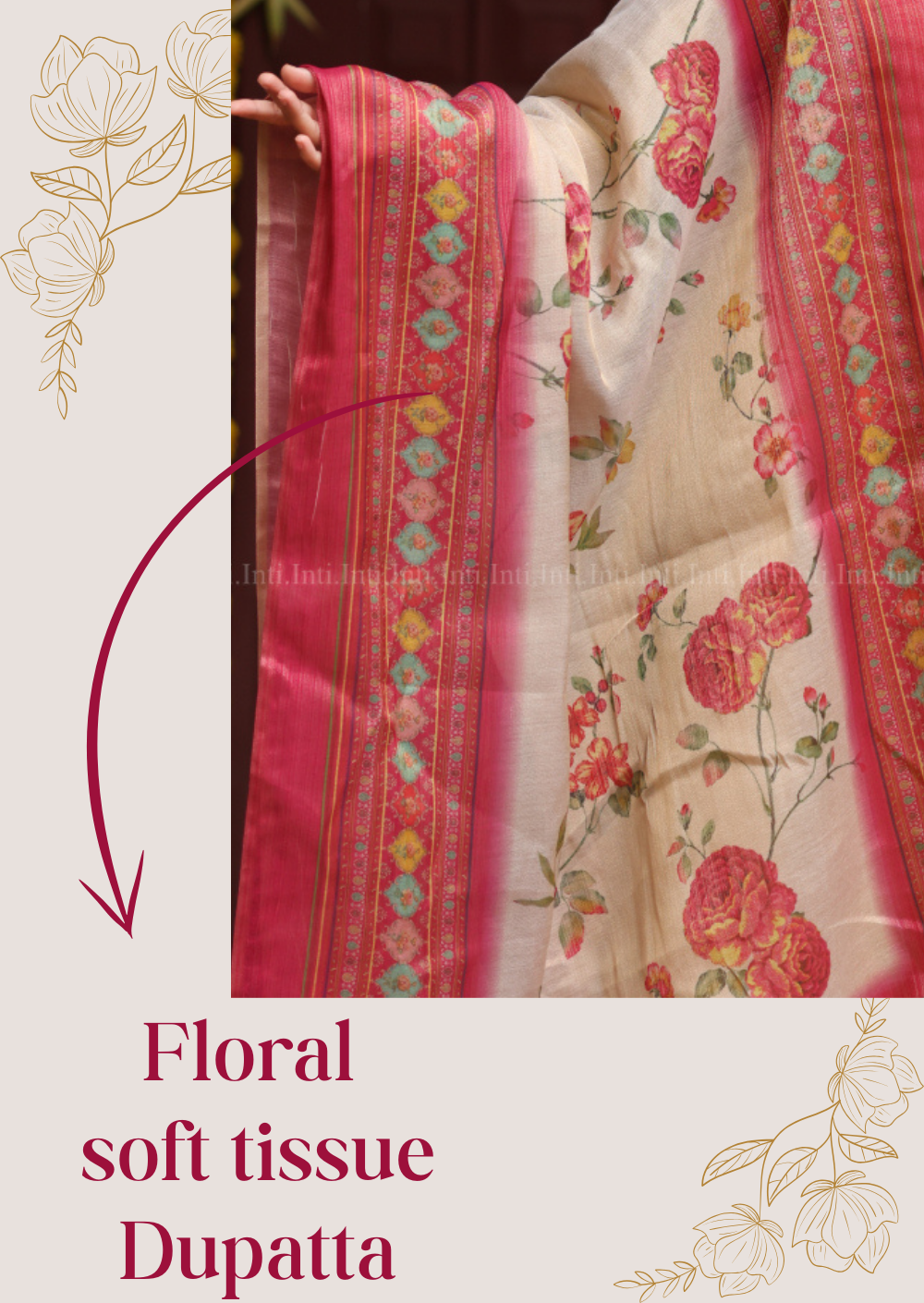 Bloom Aura celebrates understated elegance with its soft tissue fabric and thoughtfully designed silhouette. The square neckline and three-quarter sleeves create a refined frame, while the back neck knot detail adds subtle sophistication. Paired with a coordinating pink and beige floral dupatta, this ensemble offers versatile styling options. The included lining ensures comfort and durability, while the wide-leg pants feature practical pockets. Perfect for those who appreciate timeless design with contemporary ease.