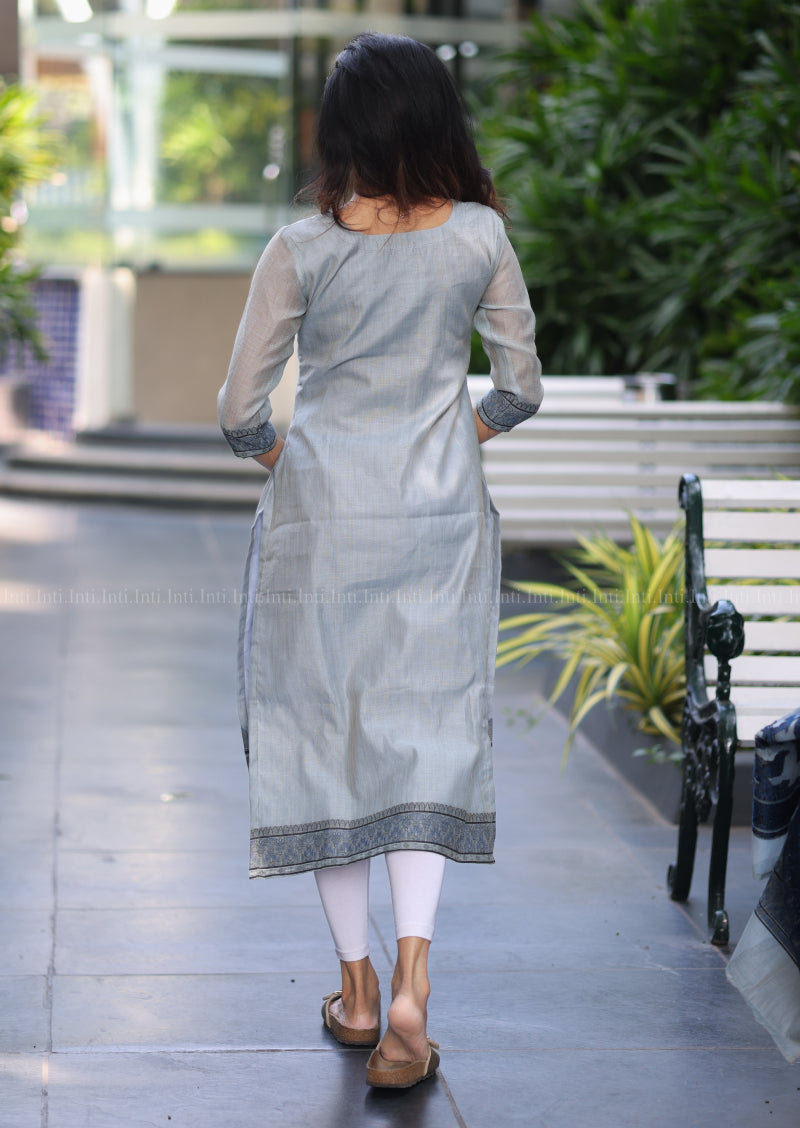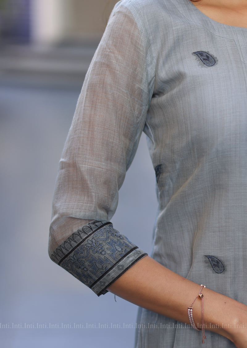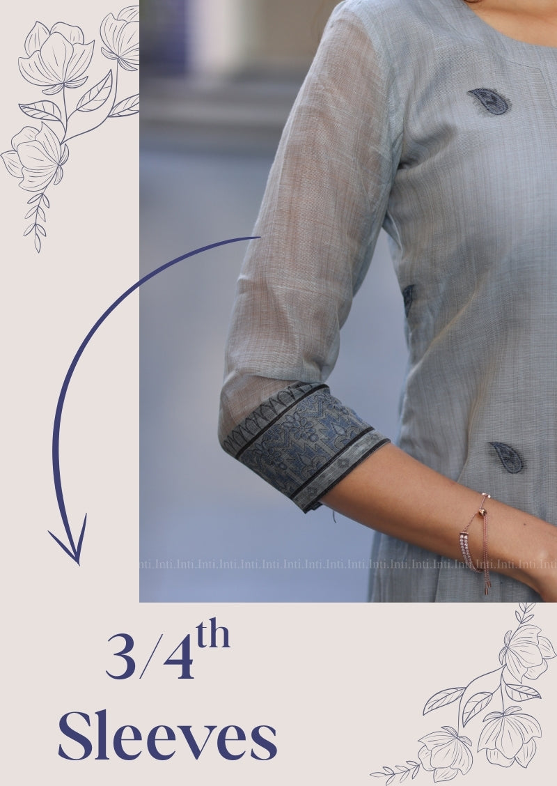 Elevate your everyday wardrobe with this refined Blue Blossom Top & Dupatta Set. Featuring a striking diamond-cut neckline accented with delicate cross straps, this piece showcases a sophisticated bluish-grey palette adorned with intricate leaf motifs and an ornate floral border. The coordinating floral dupatta adds graceful movement and versatility to your ensemble. Designed with practical 3/4-length sleeves and lined with soft cotton for comfort against the skin, this set seamlessly transitions from casual gatherings to semi-formal occasions. A timeless addition to your ethnic collection.