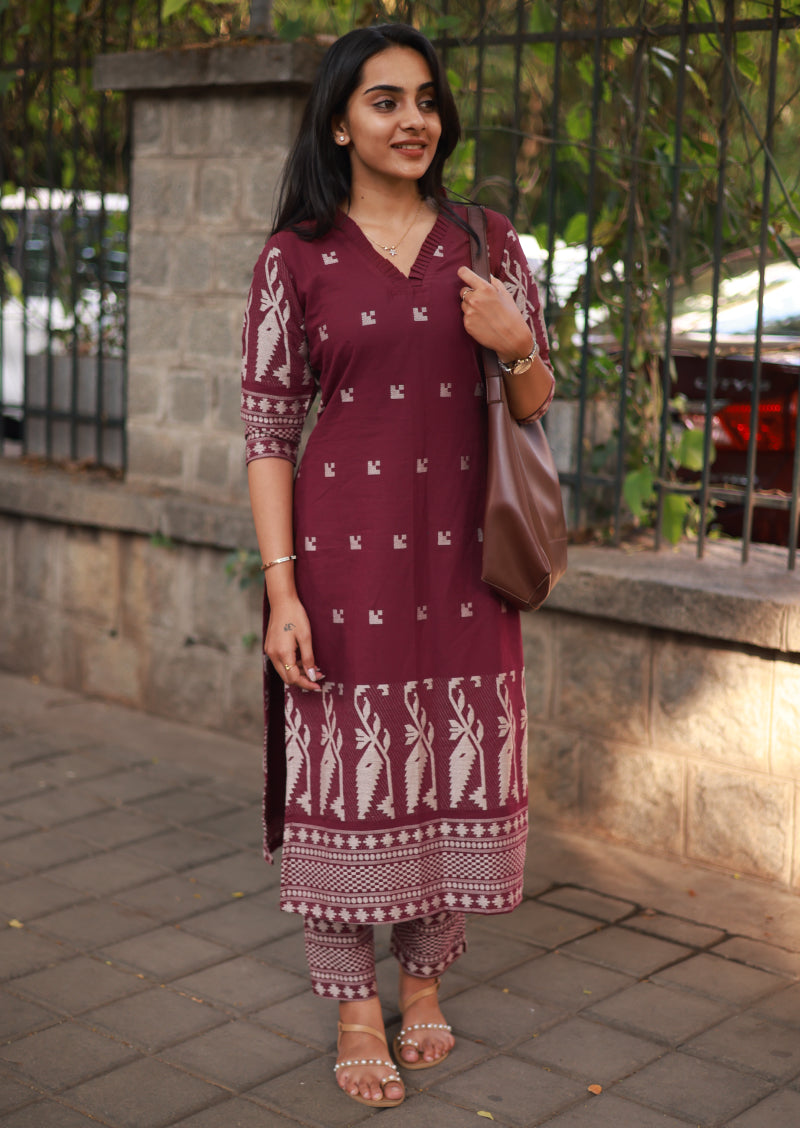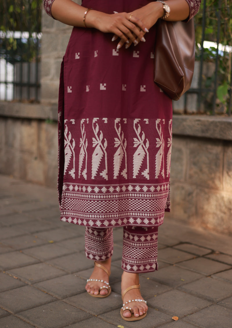 Indulge in luxury with our Claret Weaves Top and Pant Set. Featuring a V pleated neckline and three quarter sleeves, this handloom cotton set exudes sophistication. The wine color and white weaves with a big border add a touch of elegance. The pant even comes with a pocket for added convenience. Elevate your style with this exquisite set.