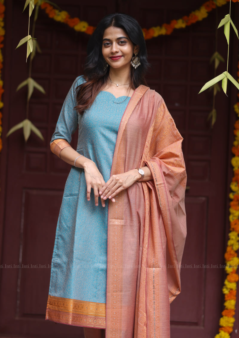 Embrace timeless elegance with this Cloud Blush Salwar Suit, designed for the modern woman who values grace and comfort. The sweetheart neckline with delicate notch detailing pairs beautifully with three-quarter sleeves adorned with intricate borders. Complemented by a flowing peach tassel dupatta that adds movement and sophistication, this ensemble features coordinating straight pants with functional pockets. Perfect for festive occasions, celebrations, or refined everyday wear, this suit seamlessly blends traditional craftsmanship with contemporary silhouettes.