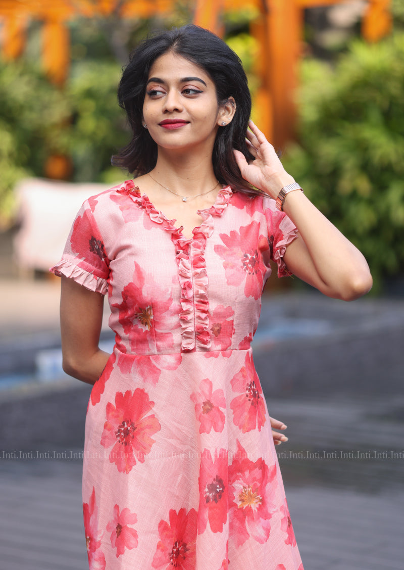 Elevate your wardrobe with this sophisticated Crush Floral Dress, featuring an enchanting pink floral print that captures effortless elegance. The graceful V-neckline is adorned with delicate ruffles, while short sleeves finished with charming frills add a refined touch. Crafted from luxurious linen zari fabric with a comfortable lining, this piece seamlessly blends breathable comfort with timeless style, making it an ideal choice for both casual gatherings and special occasions.