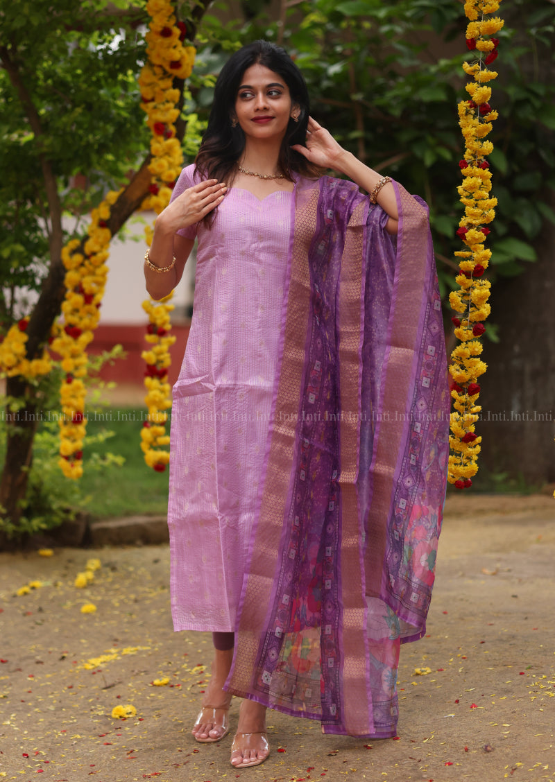 Elevate your wardrobe with this sophisticated ensemble featuring a sweetheart neckline and delicate collar detail. Crafted from luxurious raw silk with a structured lining, the short-sleeved top offers refined elegance in a serene light purple hue. The set includes an exquisite organza dupatta adorned with intricate floral patterns, adding an ethereal dimension to your look. Perfect for festive occasions, celebrations, or elevated everyday wear, this piece seamlessly blends traditional charm with contemporary grace.