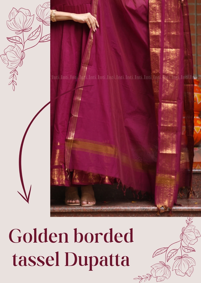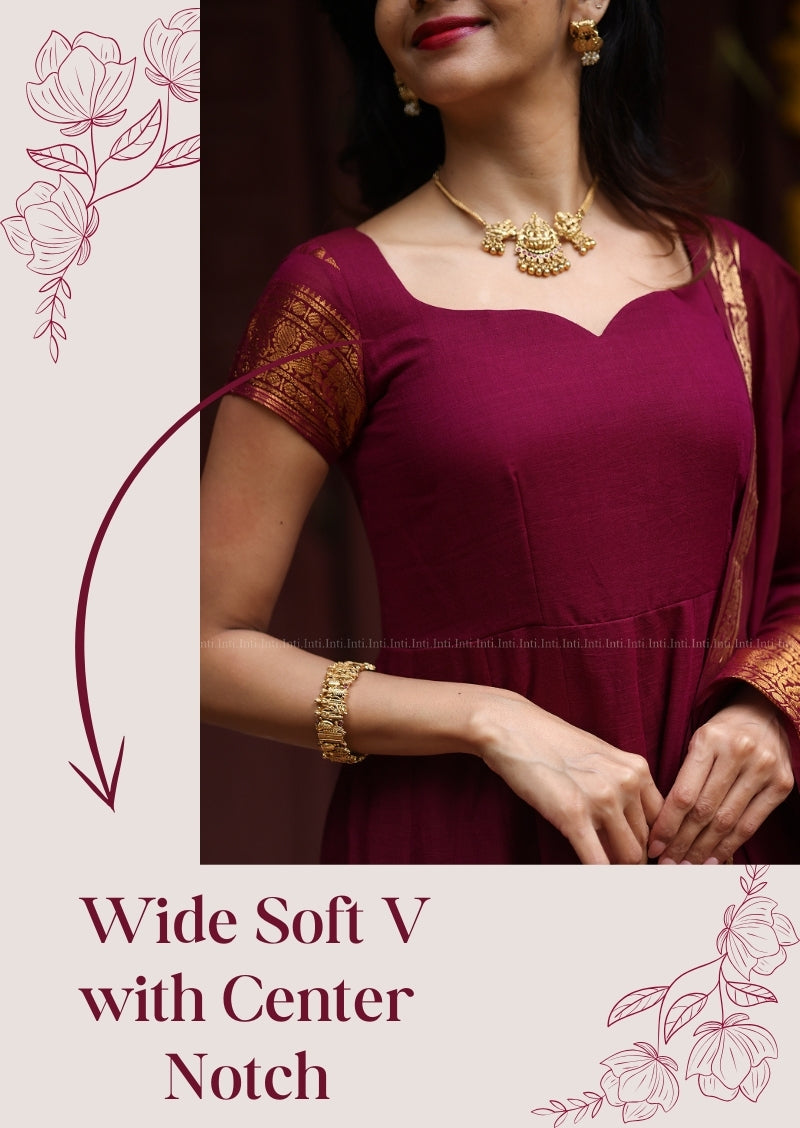 Elevate your ethnic wardrobe with this sophisticated Ishani Wine Anarkali top, crafted from premium cotton with a comfortable lining. The graceful silhouette features a flattering wide soft V-neckline with a delicate center notch, paired with classic short sleeves for effortless elegance. The rich maroon hue is beautifully complemented by the golden-bordered dupatta, creating a refined ensemble perfect for festive occasions or cultural celebrations. Designed for both comfort and style, this anarkali piece seamlessly blends traditional craftsmanship with contemporary appeal.
