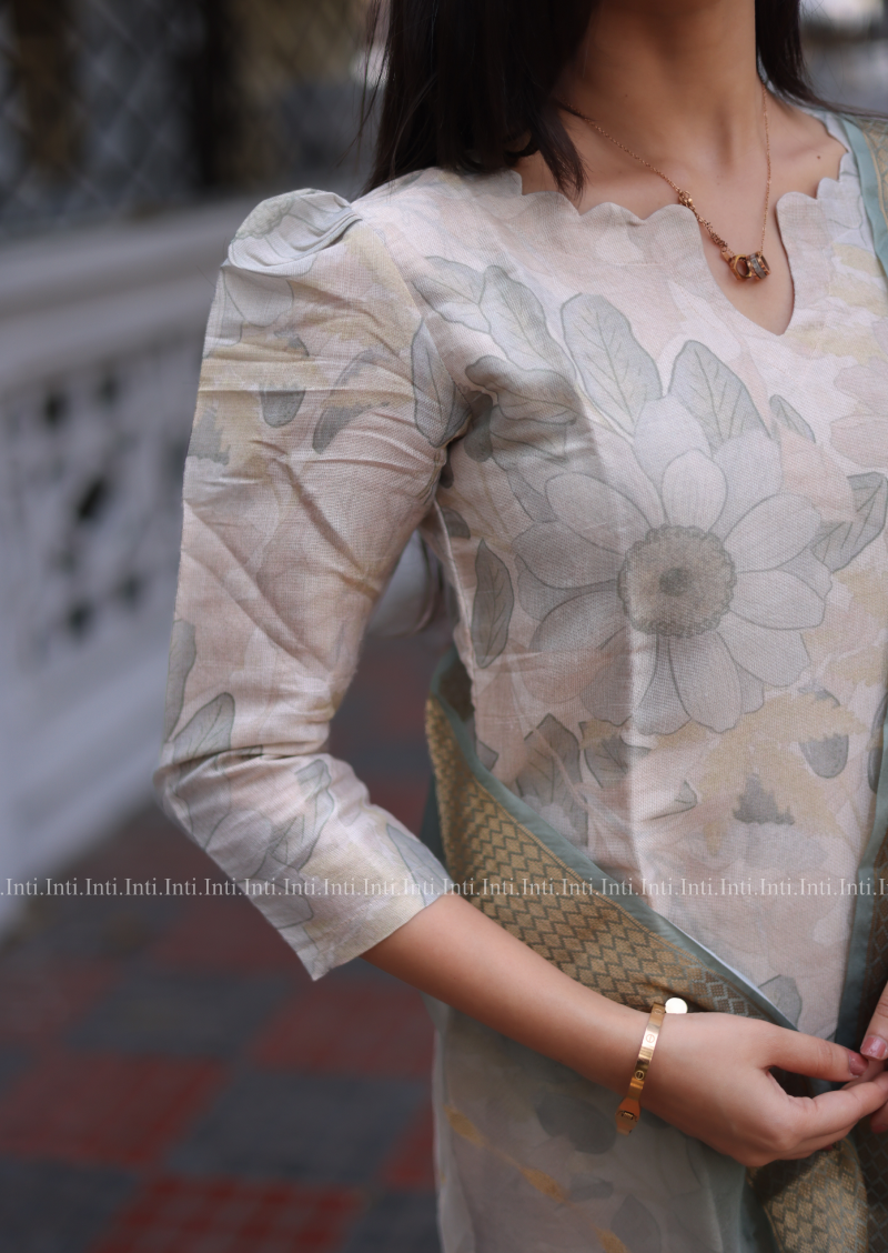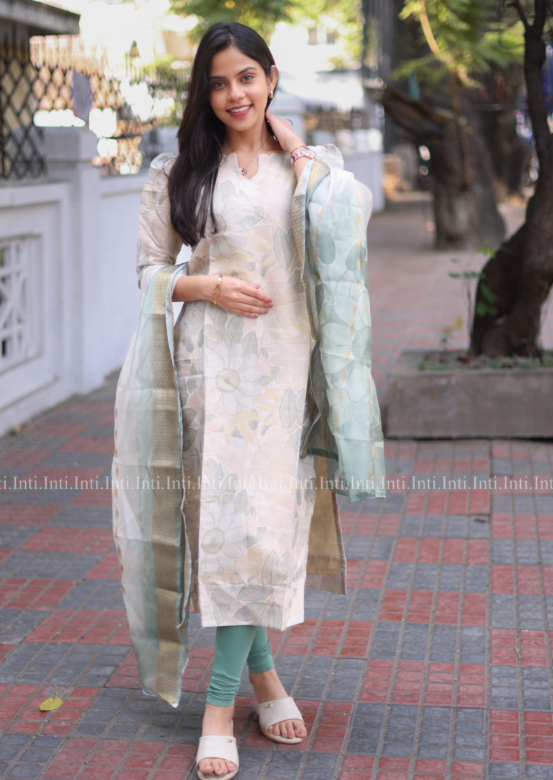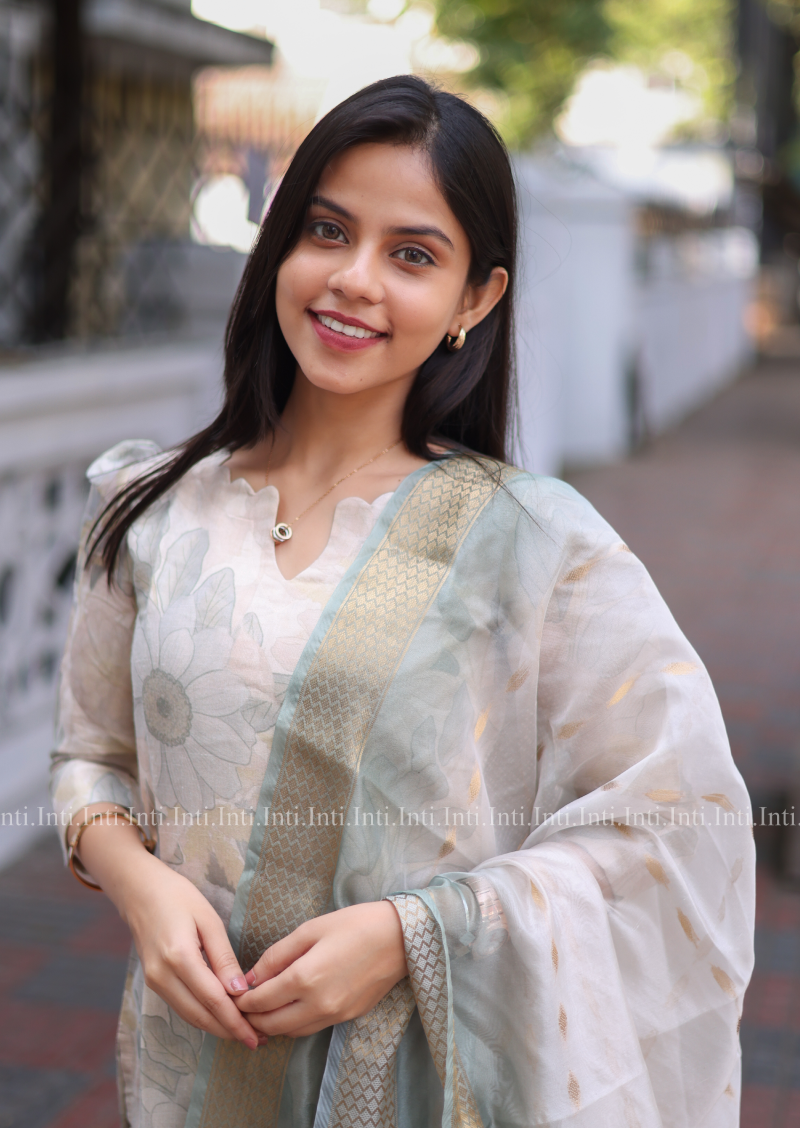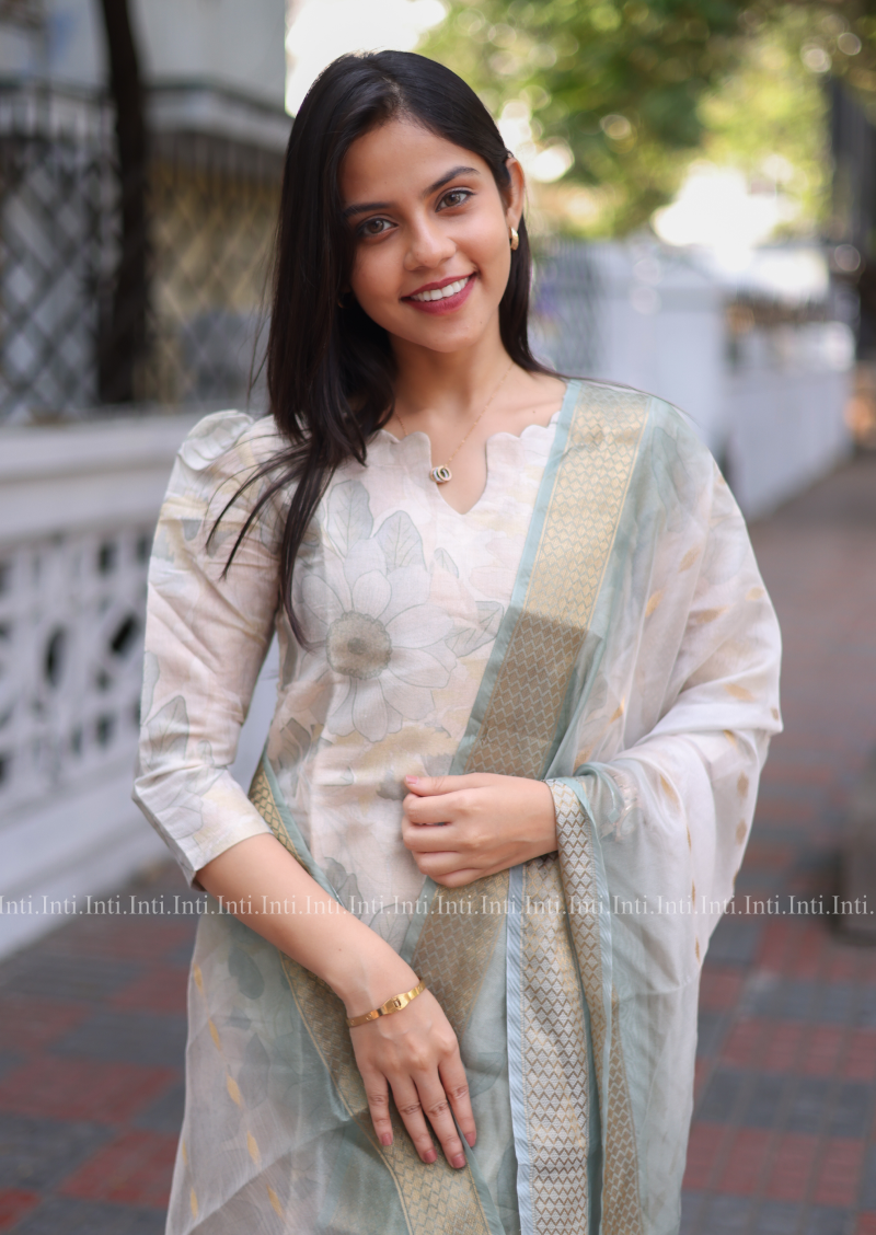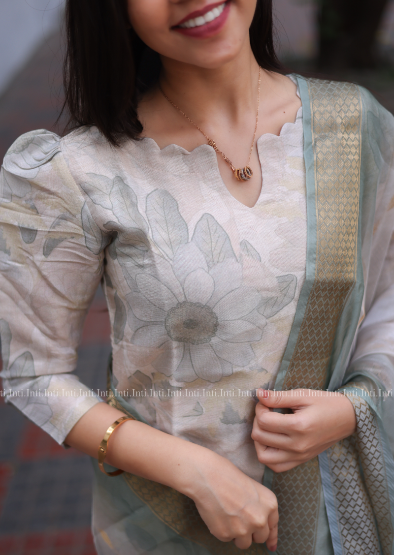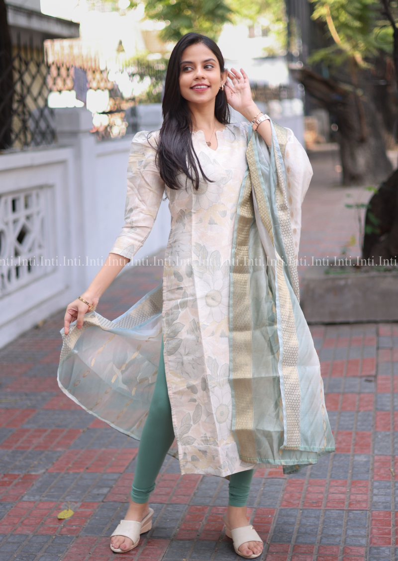 Add a touch of elegance to your wardrobe with our Lush Flora Top and Dupatta Set. The pista green floral kurti features 3/4th sleeves with a stylish puff, paired with a matching dupatta. Perfect for both casual and traditional occasions, this set is a must-have for any fashion-forward individual.