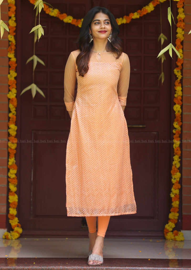 Elevate your wardrobe with the Mistic Silken Glow Top & Dupatta Set, featuring a delicate peach net fabric attached at the yoke with a subtle keyhole detail. The 3/4th net sleeves finished with fabric cuffs offer a graceful silhouette, complemented by the elegant net cross fabric. Complete the look with the matching net dupatta, adorned with a refined border, perfect for sophisticated occasions.