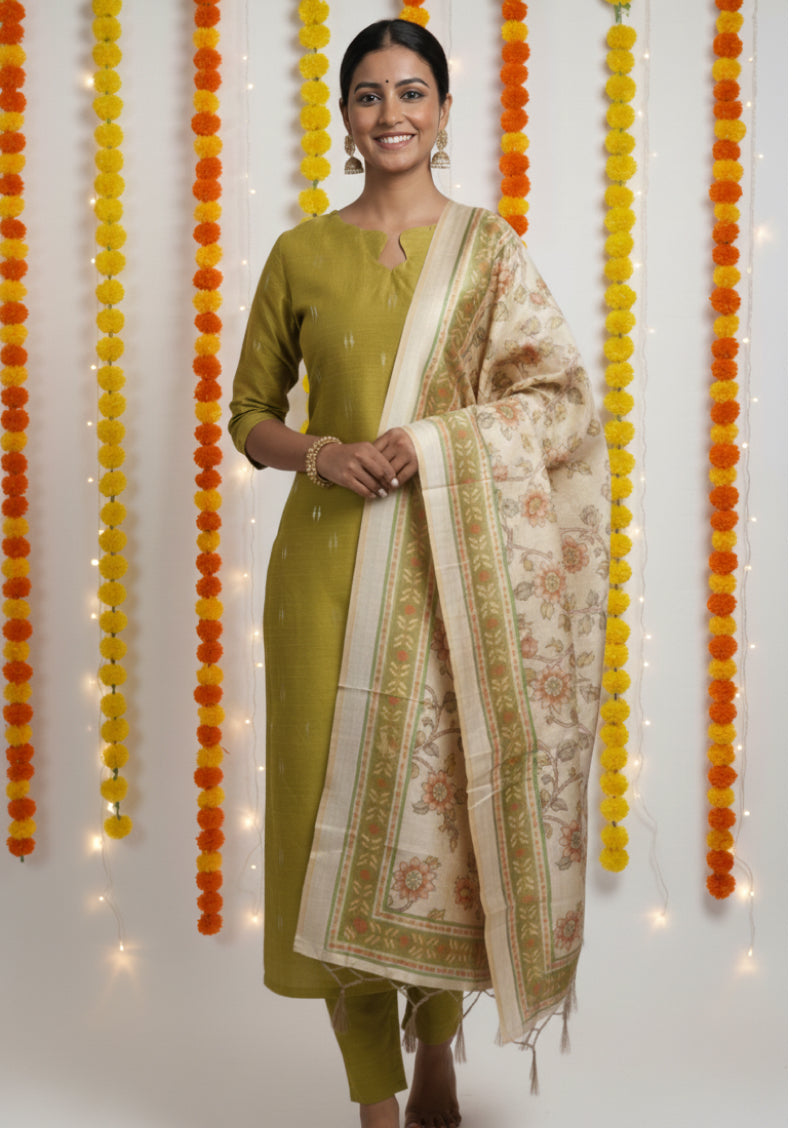 Embrace elegance with the Mogra Bloom Salwar Suit, featuring a diamond-cut scalloped neckline and graceful 3/4th sleeves. The rich green fabric pairs seamlessly with straight pants equipped with convenient pockets. A kalamkari floral dupatta in sandal tones completes the ensemble, all lined for added comfort and structure. This outfit offers a refined silhouette perfect for sophisticated occasions.