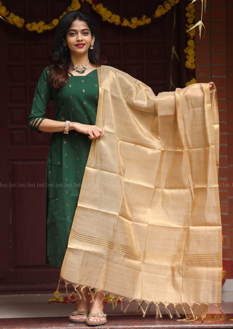 The Mystic Strap Frame Top & Dupatta Set presents a distinctive square neckline, featuring a strap on one side and a patch on the other, paired with graceful 3/4th sleeves that have attached straps. Made from soft green dupion silk embellished with golden motifs, it is accompanied by a sumptuous golden silk dupatta with lining. This ensemble elegantly combines traditional charm with contemporary flair, perfect for a polished and sophisticated style.