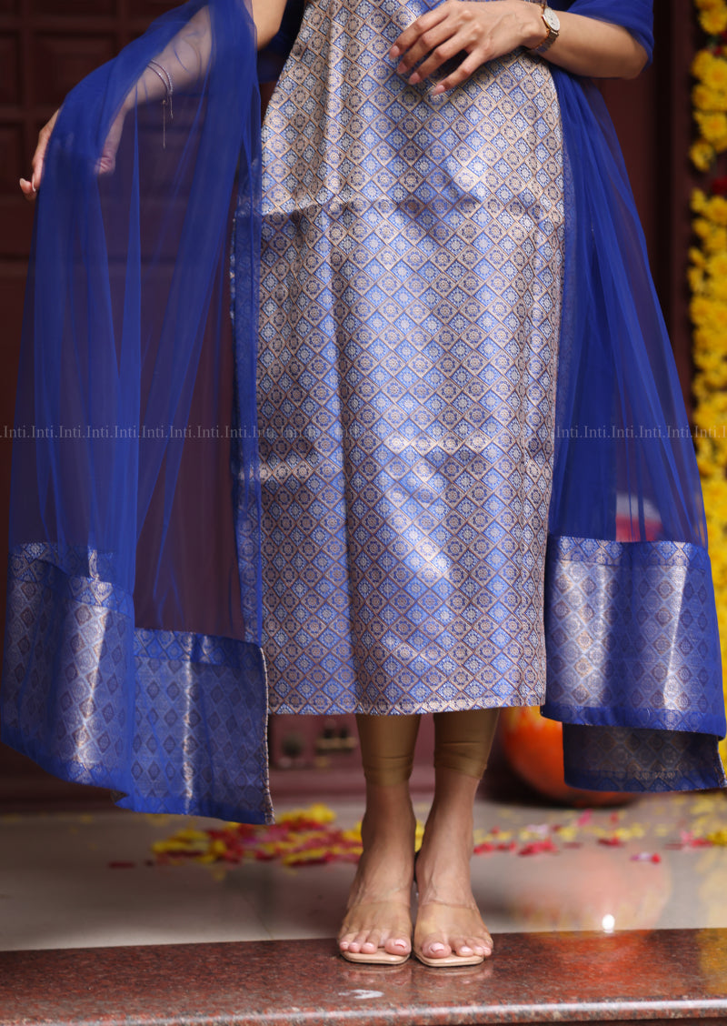 Elevate your ethnic wardrobe with this refined Nova Heirloom Top & Dupatta Set. Crafted from luxurious brocade fabric, the sleeveless top features an elegant boat neckline adorned with delicate scalloped detailing that extends to the hem, creating a graceful silhouette. The coordinating net dupatta showcases an intricate border, perfectly complementing the ensemble. Rich ink blue hue with coordinating lining ensures comfort and polish. An ideal choice for festive occasions and celebrations, this set combines traditional craftsmanship with contemporary elegance.