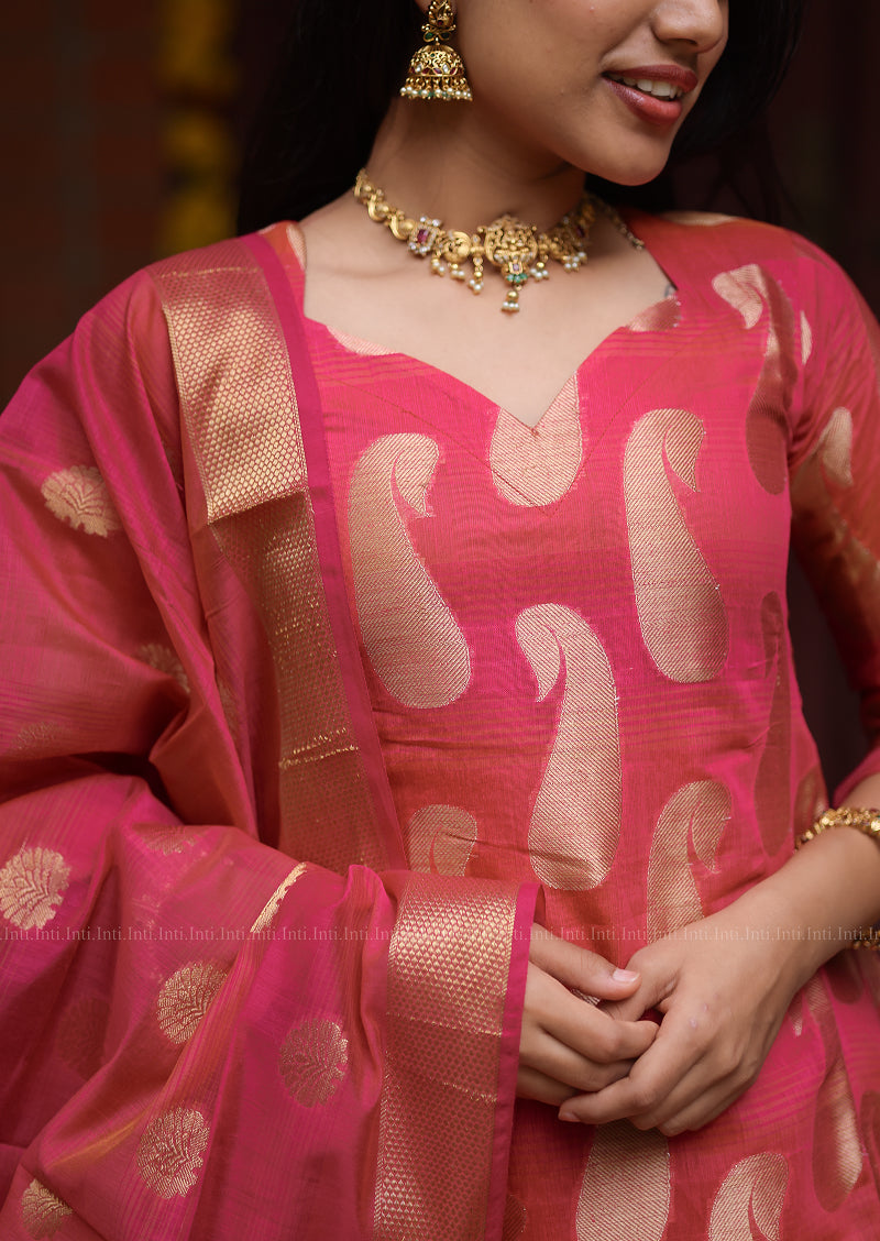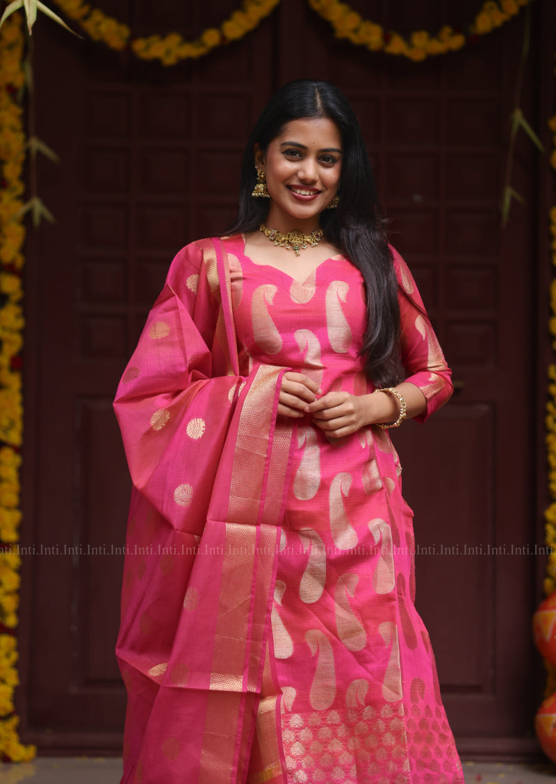 Embrace timeless elegance with this sophisticated ensemble featuring a luxurious silk-cotton blend in deep rani pink. The V-neckline and three-quarter sleeves create a refined silhouette, while the golden mango motif adds an understated touch of opulence. Paired with a matching dupatta adorned with intricate golden embroidery and delicate tassels, this set exudes grace. Practical straight-cut pants with functional pockets complete the look, ensuring both style and comfort. Fully lined for a polished finish, this piece seamlessly transitions from celebrations to everyday elegance.