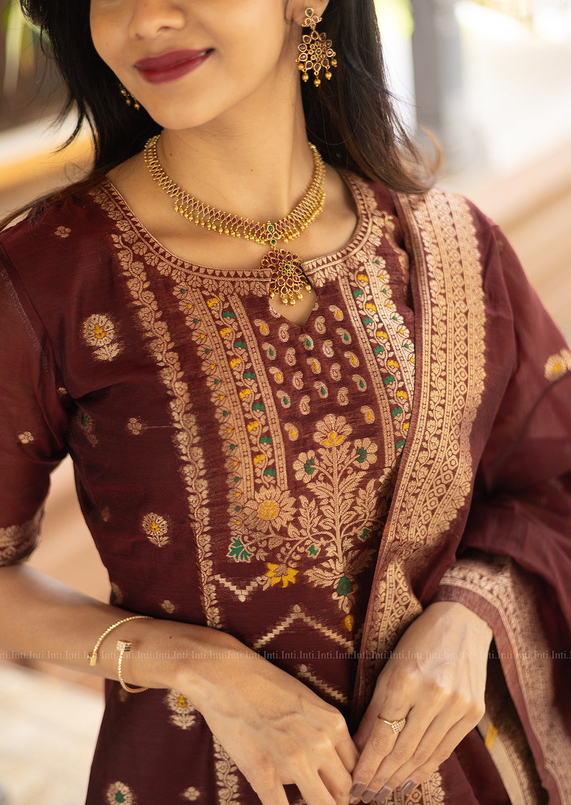 Embrace enduring elegance with the Ruby Wine Salwar Suit, fashioned from luxurious Banarasi cotton in a rich maroon tone. This refined set showcases a diamond-cut neckline and elbow-length sleeves, paired with straight pants that feature comfortable lining and handy pockets. An elegantly bordered dupatta embellished with golden motifs completes the look, combining classic appeal with sophisticated style for special occasions.