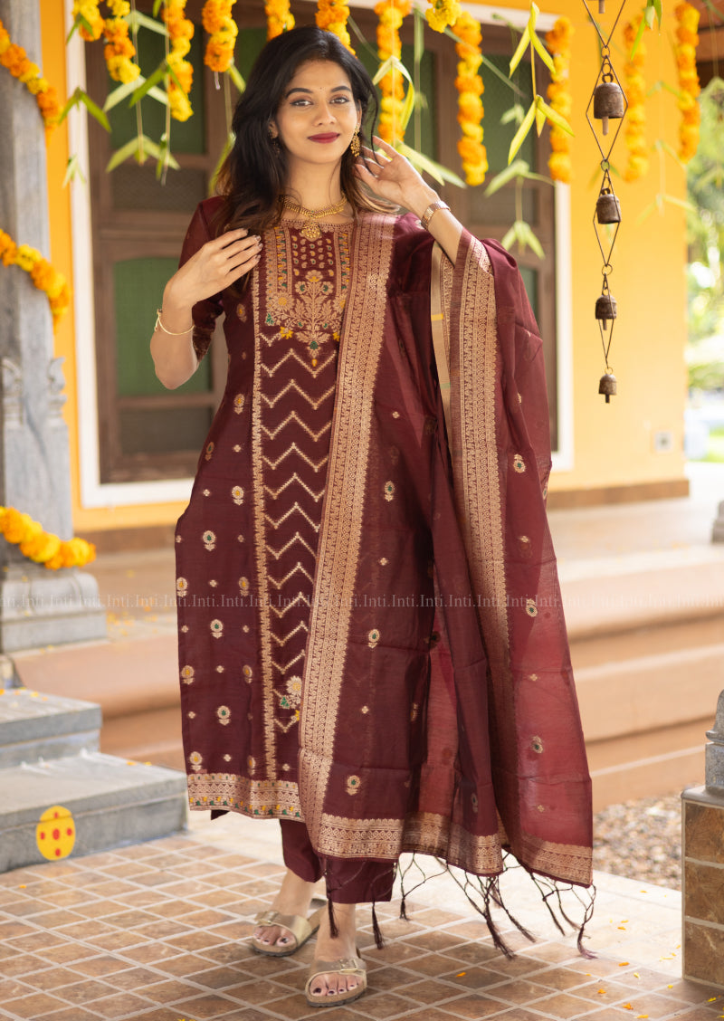 Embrace enduring elegance with the Ruby Wine Salwar Suit, fashioned from luxurious Banarasi cotton in a rich maroon tone. This refined set showcases a diamond-cut neckline and elbow-length sleeves, paired with straight pants that feature comfortable lining and handy pockets. An elegantly bordered dupatta embellished with golden motifs completes the look, combining classic appeal with sophisticated style for special occasions.