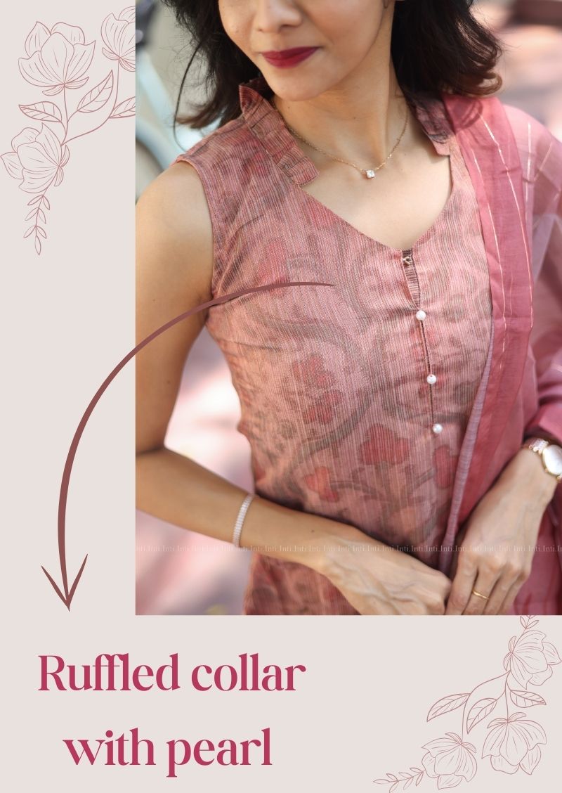 Elevate your ethnic wardrobe with this refined ensemble featuring a sleeveless top adorned with an elegant ruffled collar and delicate pearl embellishments at the front. Crafted in soft onion pink with a coordinating lining, the piece exudes understated luxury. Paired with a flowing floral print organza dupatta, this set strikes the perfect balance between traditional charm and contemporary sophistication, ideal for festive occasions and celebrations.