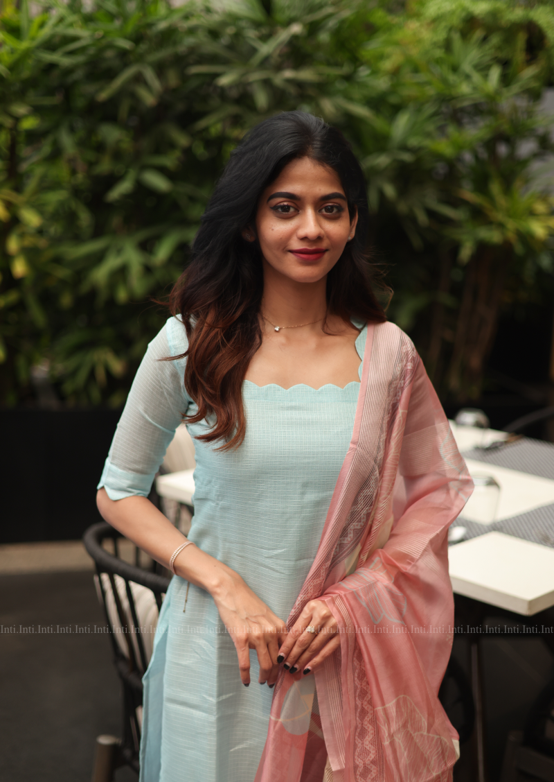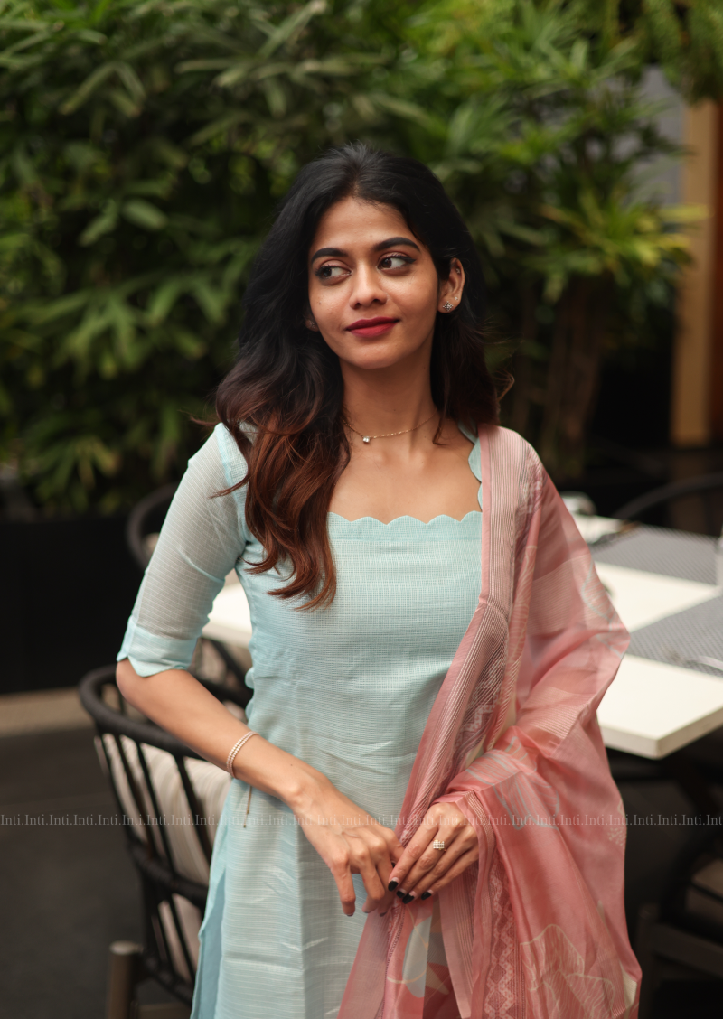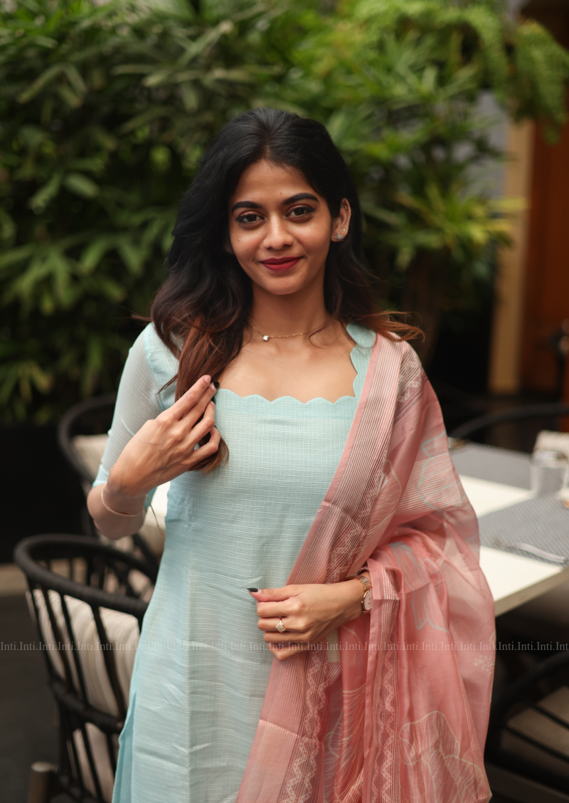 This Sky Cream Top & Dupatta Set features a refined scalloped square neckline and elbow-length sleeves finished with delicate scalloped edges. Crafted from breathable kota fabric with a soft lining, the sky blue top offers comfort and elegance. Complemented by a pink floral dupatta, this ensemble blends subtle hues and intricate details for a sophisticated look perfect for any occasion.