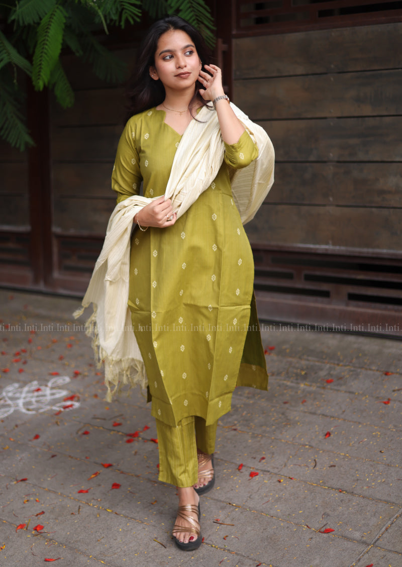 Elevate your wardrobe with the Spring Blossom Salwar Suit, featuring an elegant arrow neckline and tailored 3/4th sleeves detailed with subtle pleats. Crafted from breathable cotton fabric in a rich green hue, it pairs straight pants equipped with convenient pockets for modern functionality. The ensemble is completed with a coordinating sandal-colored dupatta, adding a refined contrast to this sophisticated yet comfortable attire. Perfect for graceful daywear or casual occasions.
