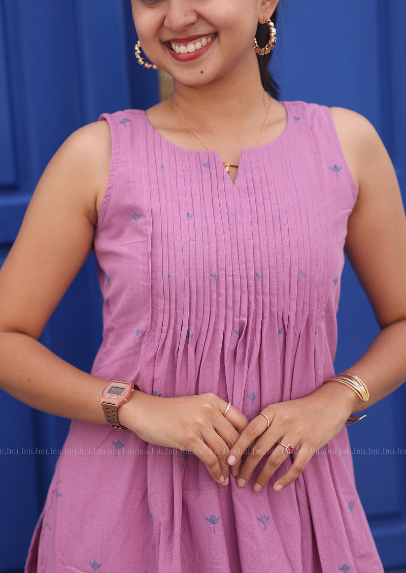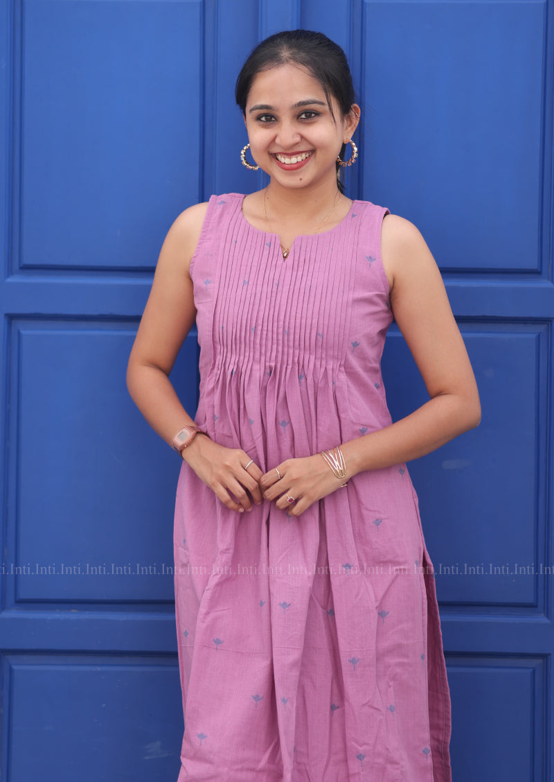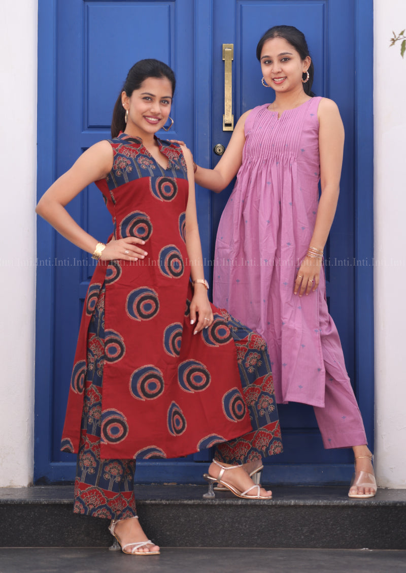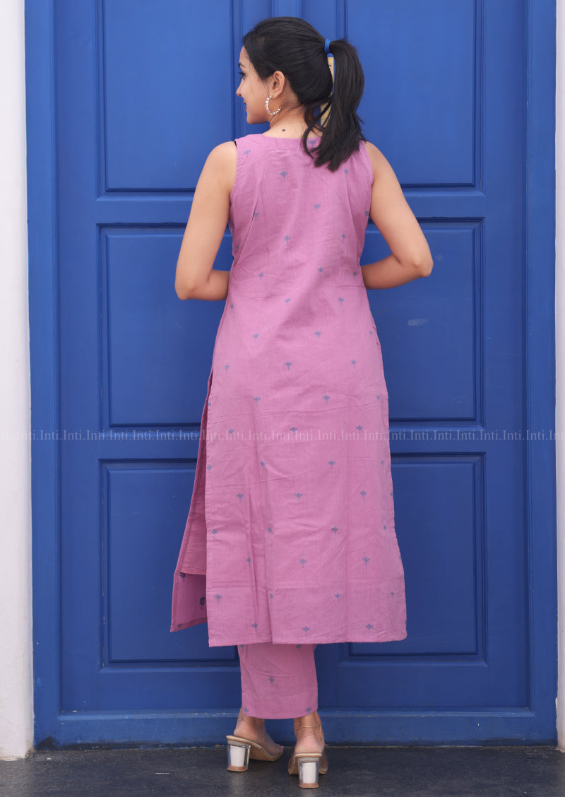 Elevate your wardrobe with this refined Sugar Plum Top & Pant Set. The sleeveless top features a delicate split V-neckline with graceful pleats, adorned with subtle tulip motifs in dusty pink cotton. Discreet attached inner sleeves provide layering versatility, while the lined construction ensures comfort and durability. Paired with tailored straight pants complete with functional pockets, this set delivers understated elegance for both casual and semi-formal occasions.