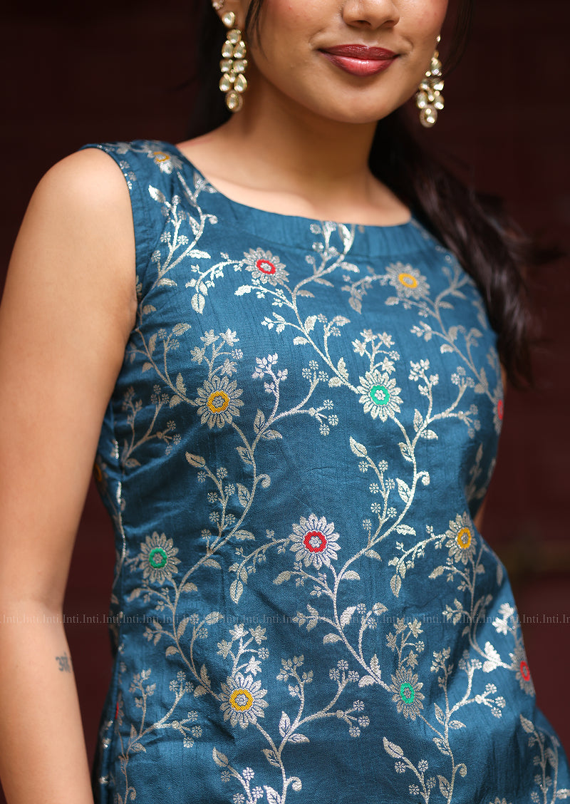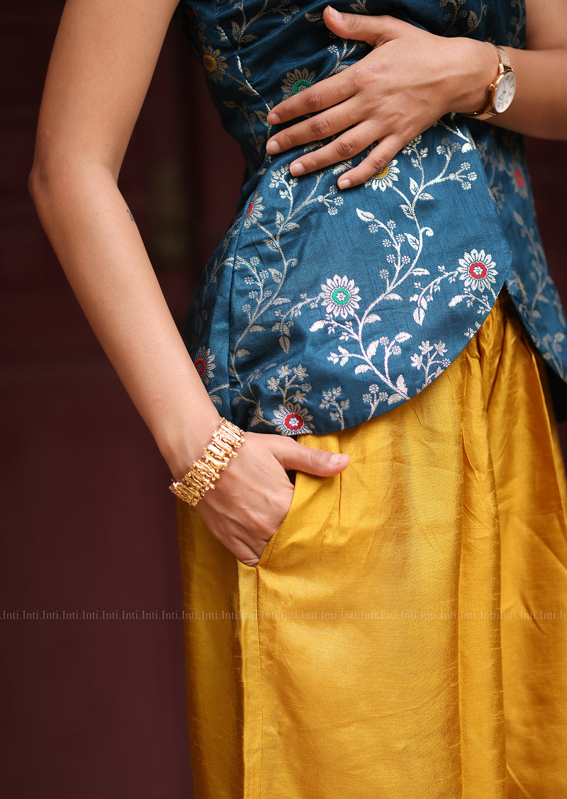 Elevate your wardrobe with this refined two-piece ensemble featuring a sleeveless crop top in luxurious blue brocade adorned with delicate silver floral motifs. The sophisticated boat neckline and front curve cut create a flattering silhouette, while the concealed back zip ensures effortless styling. Paired with vibrant yellow flare pants complete with functional pockets, this set strikes the perfect balance between contemporary elegance and comfort. Fully lined for a polished finish.