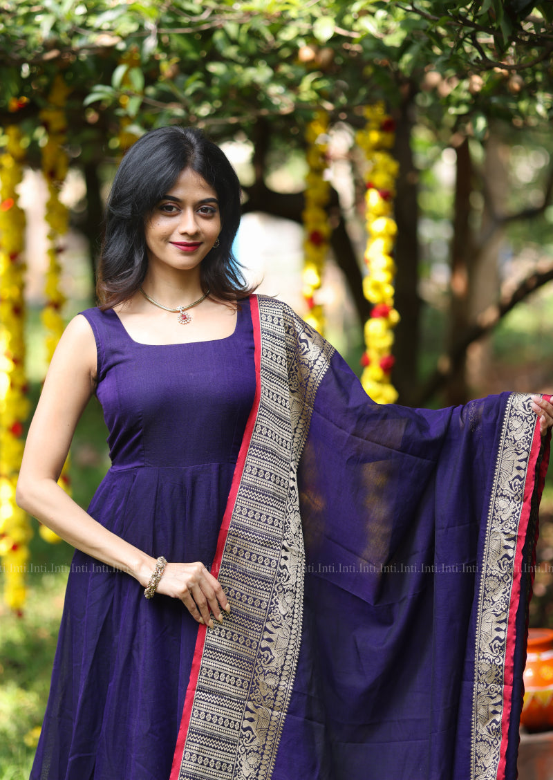 Embrace timeless elegance with this sophisticated sleeveless top, featuring a refined square neckline and attached elbow sleeves for versatile styling. Crafted from premium cotton with a comfortable lining, this piece showcases an exquisite elephant and flower motif border in rich dark violet. The intricate embroidery details add an heirloom quality, making it perfect for both casual gatherings and special occasions. A wardrobe essential that seamlessly blends traditional artistry with contemporary design.