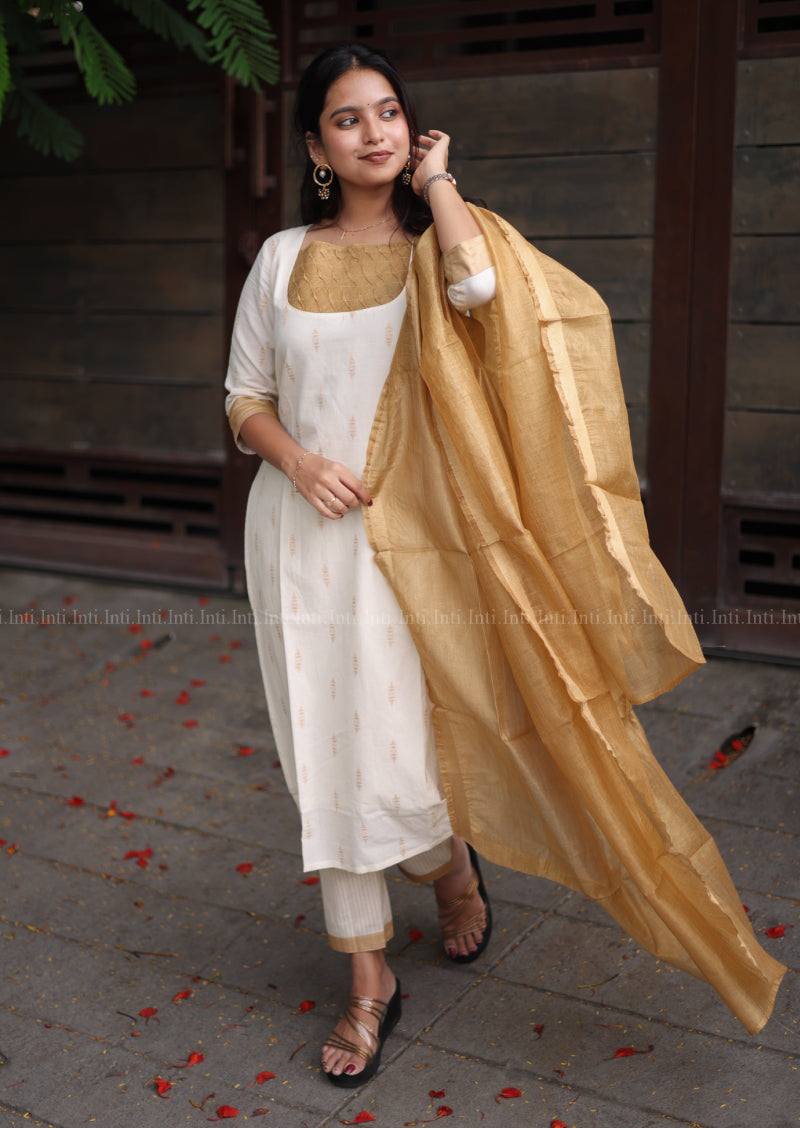 Elevate your ethnic wardrobe with the Varnika Krithi Salwar Suit, crafted from luxurious tussar silk in pristine white. Featuring a deep round neck adorned with intricate gold patchwork and delicate stitching, this ensemble exudes refined elegance. The 3/4th sleeves end in tailored cuffs, complementing the straight pants designed with practical pockets and a gold-fabric border. Paired with a shimmering golden dupatta, this suit offers a sophisticated blend of tradition and contemporary style perfect for special occasions.