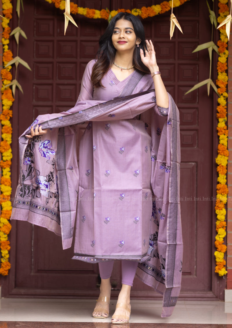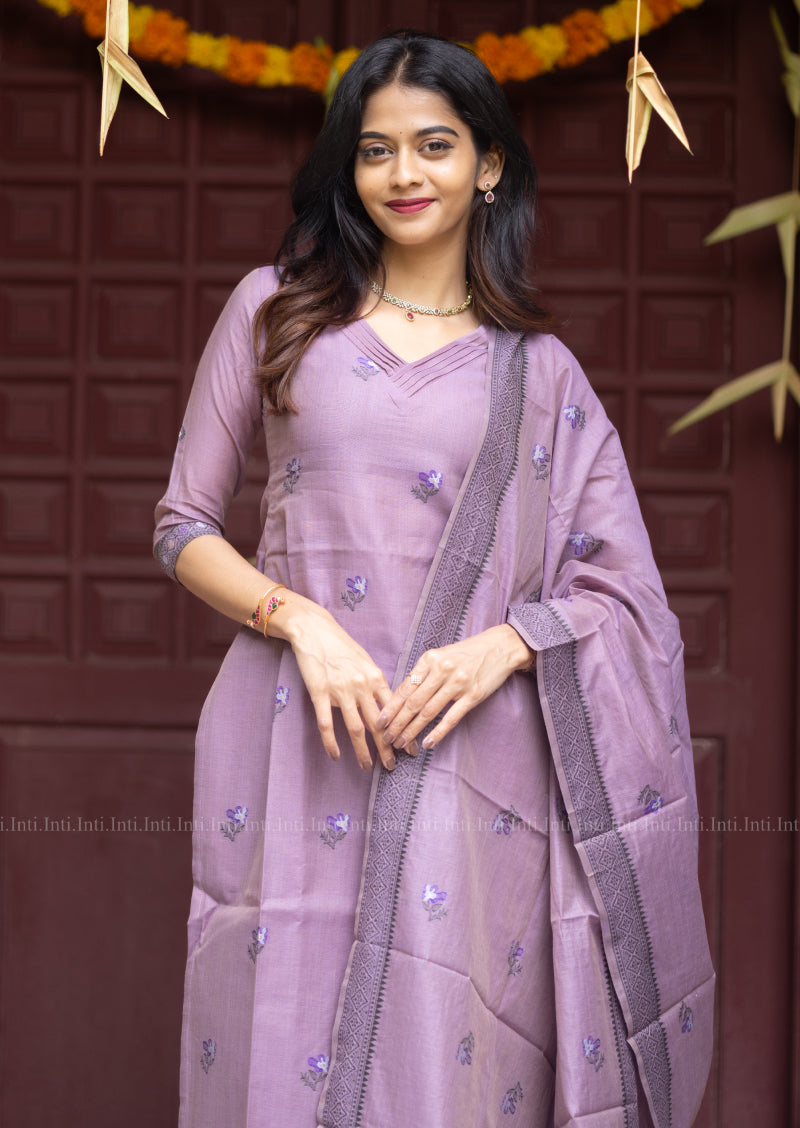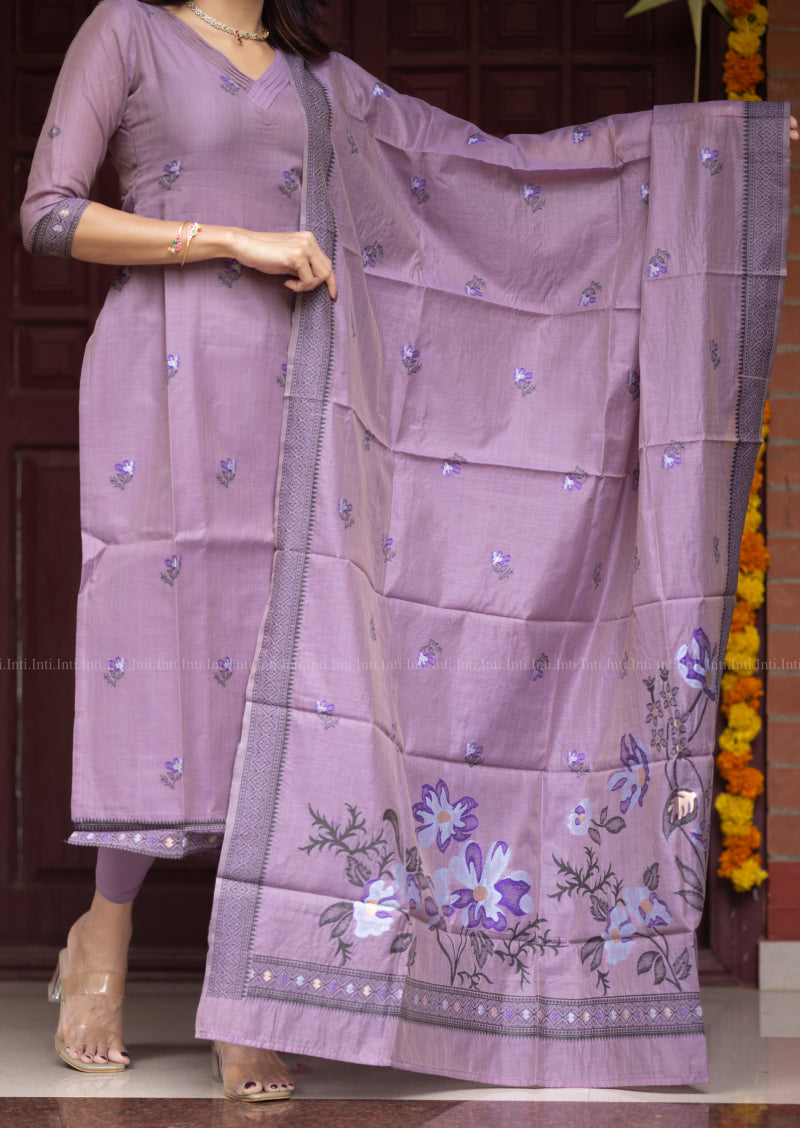 Embrace timeless elegance with the Vintage Petal Top & Dupatta Set in a refined dusty purple shade. Crafted from luxurious Chanderi fabric, the top features a pleated V neckline and graceful 3/4th sleeves adorned with delicate pleats, enhancing its sophisticated charm. Intricate floral motifs add a touch of subtle artistry, complemented by a soft cotton lining for comfortable wear. The matching floral dupatta completes the ensemble, making it perfect for occasions that call for understated yet exquisite style.