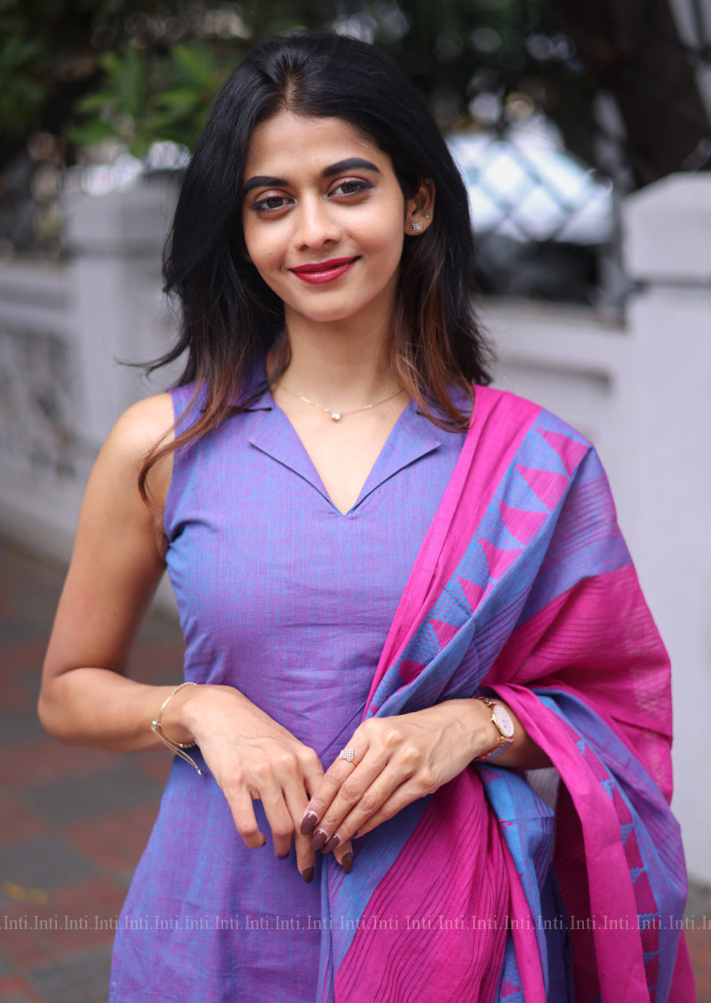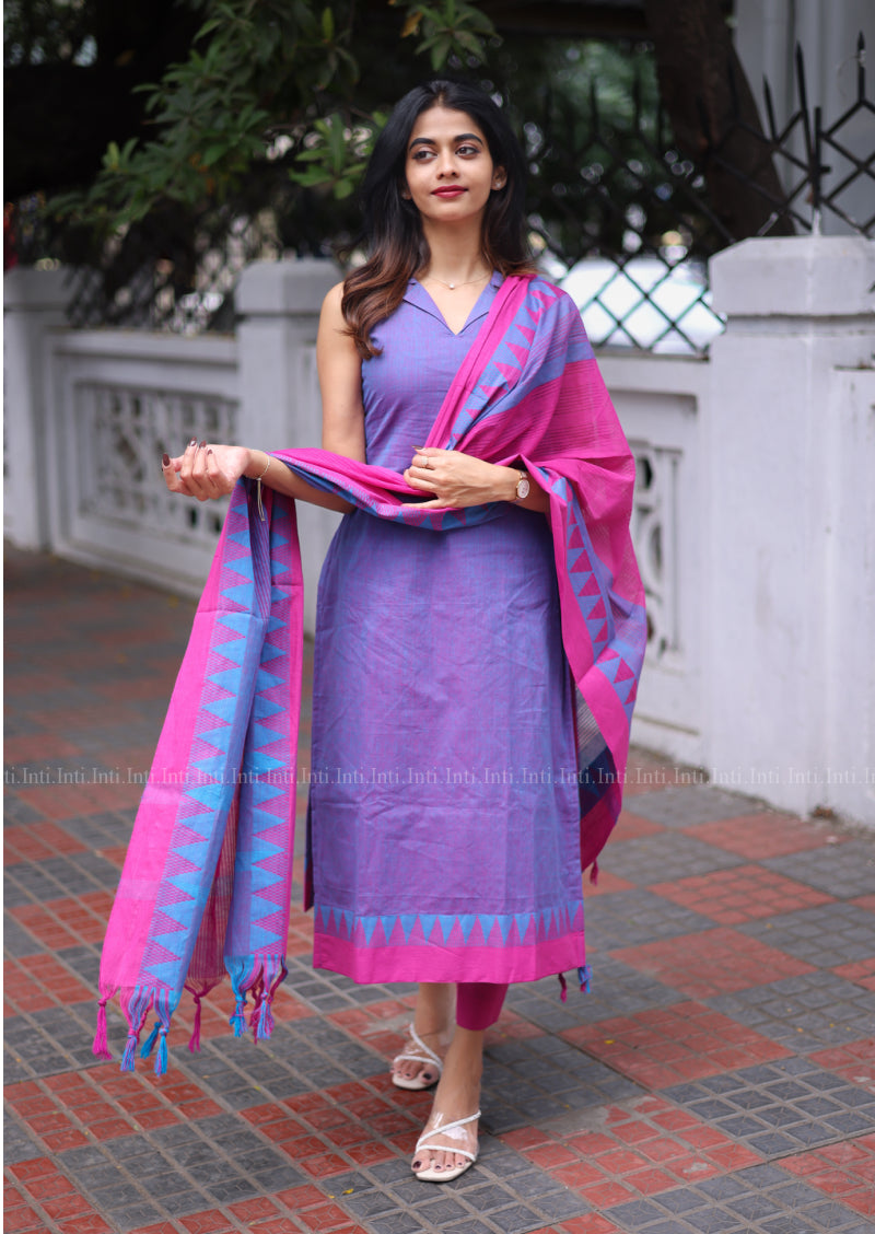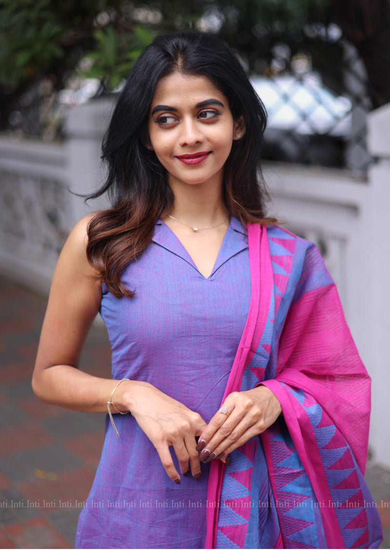 The Wildberry Drift Salwar Suit exudes refined elegance with its handloom cotton fabric in a rich purple hue. Featuring a sleeveless design complemented by a distinctive reverse collar, it offers a modern silhouette. Attachable elbow sleeves add versatility, while the straight pants with pockets provide comfort and practicality. The contrasting color dupatta completes this sophisticated ensemble, perfect for occasions where understated style meets functional grace.